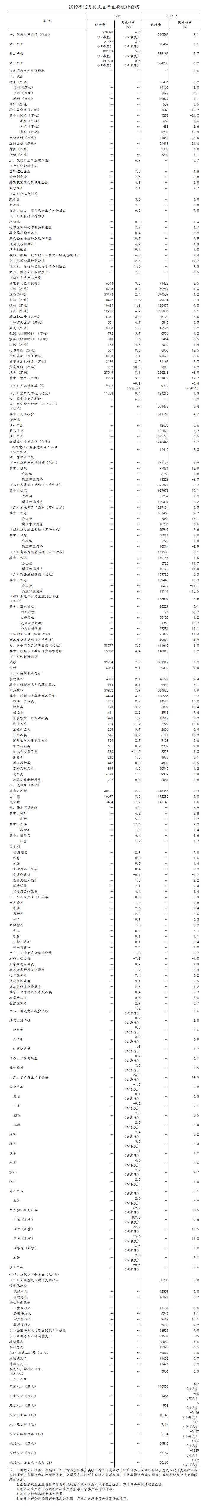 (3)规模以上工业的统计范围为年主营业务收入2000万元及以上的工业企业。由于规模以上工业企业范围每年发生变化,为保证本年数据与上年可比,计算产品产量等各项指标同比增长速度所采用的同期数与本期的企业统计范围尽可能相一致,和上年公布的数据存在口径差异。主要原因:一是统计单位范围发生变化。每年有部分企业达到规模纳入调查范围,也有部分企业因规模变小退出调查范围,还有新建投产企业、破产、注(吊)销企业等影响。二是部分企业集团(公司)产品产量数据存在跨地区重复统计现象,根据专项调查对企业集团(公司)跨地区重复产量进行了剔重。