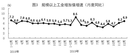 全年全国规模以上工业增加值比上年增长5.7%。分经济类型看,国有控股企业增加值增长4.8%;股份制企业增长6.8%,外商及港澳台商投资企业增长2.0%;私营企业增长7.7%。分三大门类看,采矿业增加值增长5.0%,制造业增长6.0%,电力、热力、燃气及水生产和供应业增长7.0%。高技术制造业和战略性新兴产业增加值分别比上年增长8.8%和8.4%,增速分别比规模以上工业快3.1和2.7个百分点。12月份,规模以上工业增加值同比增长6.9%,比上月加快0.7个百分点,环比增长0.58%。12月份,制造业采购经理指数(PMI)分项指数中,生产指数、新订单指数和供应商配送时间指数分别为53.2%,51.2%和51.1%,均高于临界点。制造业生产经营活动预期指数为54.4%,位于较高景气区间。