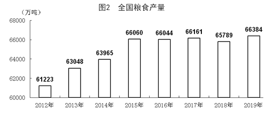 全年全国粮食总产量66384万吨,比上年增长0.9%,增产594万吨,连续5年保持在65000万吨以上。其中,夏粮产量14160万吨,增长2.0%;早稻产量2627万吨,下降8.1%;秋粮产量49597万吨,增长1.1%。分品种看,小麦产量13359万吨,增长1.6%;玉米产量26077万吨,增长1.4%;大豆产量1810万吨,增长13.3%。全年猪牛羊禽肉产量7649万吨,比上年下降10.2%。其中,牛肉产量667万吨,增长3.6%;羊肉产量488万吨,增长2.6%;禽肉产量2239万吨,增长12.3%;禽蛋产量3309万吨,增长5.8%;牛奶产量3201万吨,增长4.1%;猪肉产量4255万吨,下降21.3%。