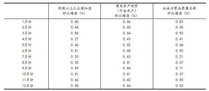(2)根据季节调整模型自动修正结果,对近一年来各期国内生产总值、规模以上工业增加值、固定资产投资(不含农户)、社会消费品零售总额环比增速进行修订。修订结果及2019年四季度GDP环比数据、2019年12月份其他指标环比数据如下:
